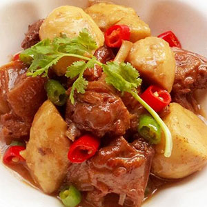 食材:鴨500克、芋仔350克、青椒1根、紅椒1根、姜15克、油適量、鹽1茶匙、糖1.5茶匙、生抽1湯匙、老抽1茶匙、米酒1湯匙、鴨肉浸膏