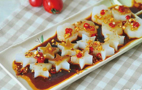 主料:豌豆淀粉520G、水650G、大蒜6瓣 調料:芝麻油適量、鹽少許、醬油適量、醋適量、麻辣油