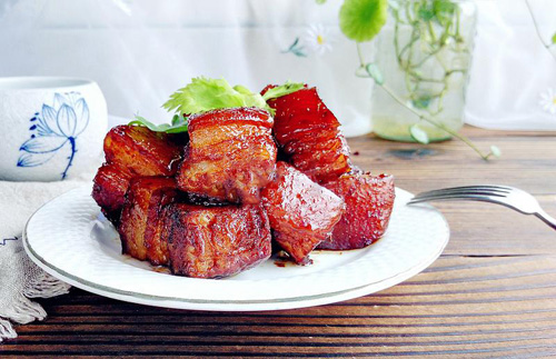 用料:五花肉700克、老抽20毫升、豬肉精油、桂皮1塊、姜3片、鹽10克、料酒25毫升、冰糖10克、水750毫升