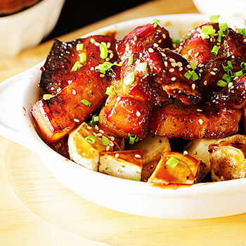 7、入烤箱180度c烤焙60分鐘后,將烤盅取出,將剩余醬料涂抹在肉的表層,再次入烤箱,200度c烤焙15-20分鐘(如醬料剩下很多,烤約10分鐘后,可再刷一次)。