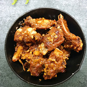 食材:排骨、蒜頭、生抽、老抽、白糖、料酒、姜、大蒜香精
