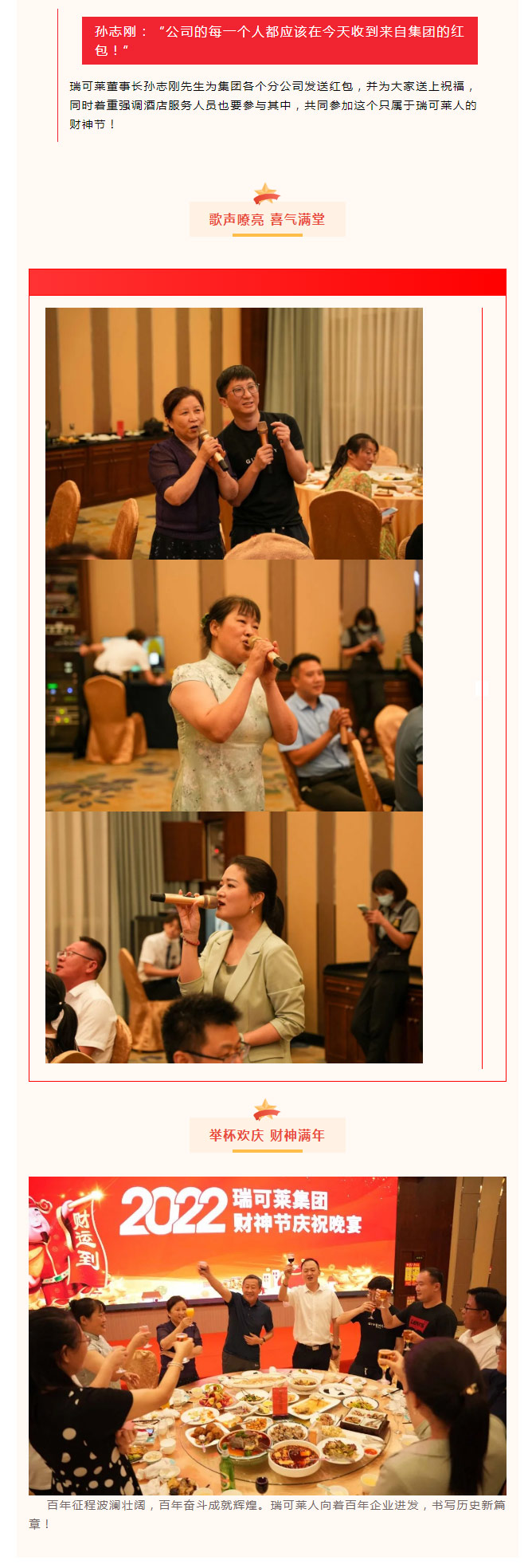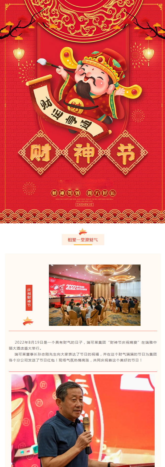 新聞摘要: 2022年8月19日是一個具有財氣的日子,瑞可萊集團“財神節慶祝晚宴”在瑞雅中頤大酒店盛大舉行。