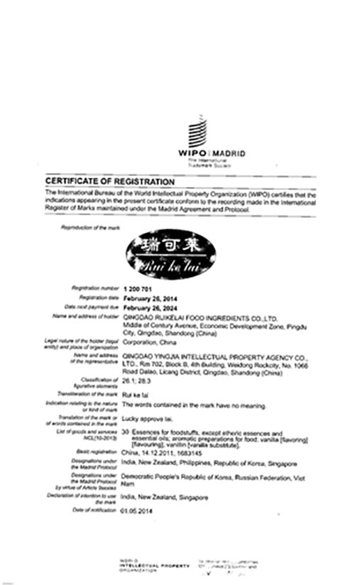 2014年5月,青島瑞可萊餐飲配料有限公司“瑞可萊”馬德里商標國際注冊成功!