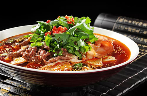4、將冒熟透的食材,提出菜簍盛入碗中淋上新青大牌冒菜紅油30g,最后加入芹菜粒15g、蔥花15g、香菜20g、小米辣25g、芝麻15g,香辣留香的一份成都冒菜就做好啦!
