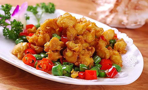 3、油溫升至7成,炸至金黃色,這樣主料才不會油膩。鍋內(nèi)流油,放入姜、蔥、蒜、洋蔥粒100g,方形青紅椒片各100g微炒,放入掌中寶,大火煸炒裝盤即可。