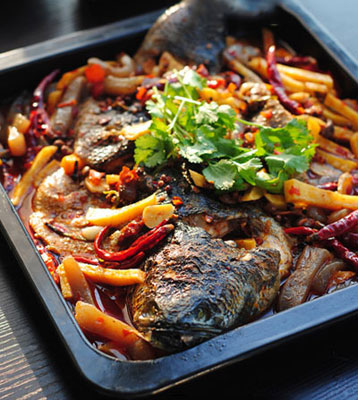 8、在魚的身上淋上一層做好的泡椒混合材料,翻一面入在鋪好蔥姜蒜的烤盤里,倒入剩下的材料,撒上蔥姜蒜。放入預(yù)熱的烤箱中層,220度,上下火,烤40分鐘,中途刷一次紅油。