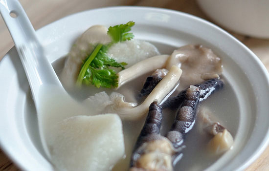 6、把山藥塊、焯過水的蘑菇、骨髓浸膏倒入砂鍋后,繼續小火燉制20分鐘后,加適量精鹽即可。
