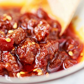 10、炒至牛肉丁變色,肉丁收縮沒有水分,倒入黃豆醬小火翻炒。持續的翻炒后,牛肉丁裹滿黃豆醬會成團,并與油分離,這時候可以倒出多余的油,多出的油味道極香用來烹制菜肴很不錯。