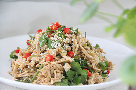 3、蒸好的雞胸脯揉純手工撕碎撕成細長條,越細越好。